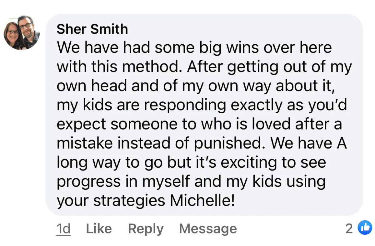 "We have had some big wins over here with this method... We have a long way to go but it's exciting to see progress in myself and my kids using your strategies Michelle!"